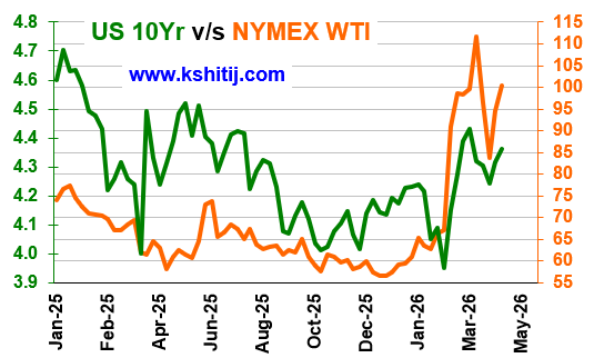 In our last report (28-Mar-26, UST10Yr 4.43%), we had assumed little chances of the USA being able to easily extricate itself from the US-Israel-Iran war, and we said that as long Brent remains above $80, we can look for a sharper rise in the US10Yr towards …. Read More